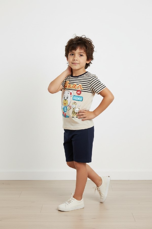 Yaz aylarında çocukların en çok tercih ettiği kıyafetlerden biri olan bu tişört ve şort takımı, hem serin tutma özelliği hem de eğlenceli tasarımı ile çocukların favorisi olmaya aday. Tişört üzerindeki sevimli ayıcık baskısı, miniklerin hayal dünyasını zenginleştirirken, çizgili detaylar ise güncel moda trendlerine uyum sağlar.