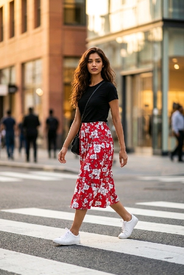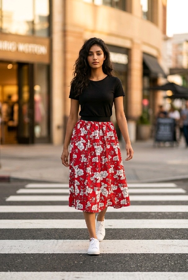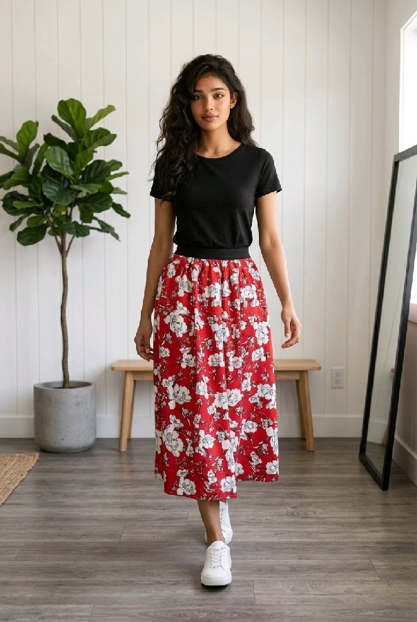 Canlı kırmızı rengi ve göz alıcı çiçek desenleri, her mevsimde enerjinizi artırmak için özel olarak seçilmiştir. Yaz aylarının sıcak günlerinde serin kalmanızı sağlarken, kış mevsiminde de kat kat giyerek şık bir görünüm elde etmenizi kolaylaştırır. Çiçek desenleri, eteklerinizde feminen bir dokunuş yaratırken, bu ürünü her türlü üst giysi ile kombinlemeyi mümkün kılar.
