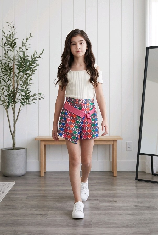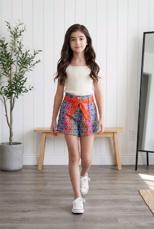 Şortun en dikkat çekici özelliği, zengin ve canlı renklerden oluşan geometrik desenidir. Farklı geometrik şekiller ve canlı tonlar, şorta modern bir hava katarken, küçük kızların özgüvenini artıran bir stil sunar. İnce kuşağı, bel kısmında harika bir detay olarak öne çıkıyor. Bu kuşak, hem işlevsellik sunuyor hem de estetik bir görünüm sağlıyor. Kuşağın zarif bağlanması, şortun şıklığını tamamen tamamlıyor.