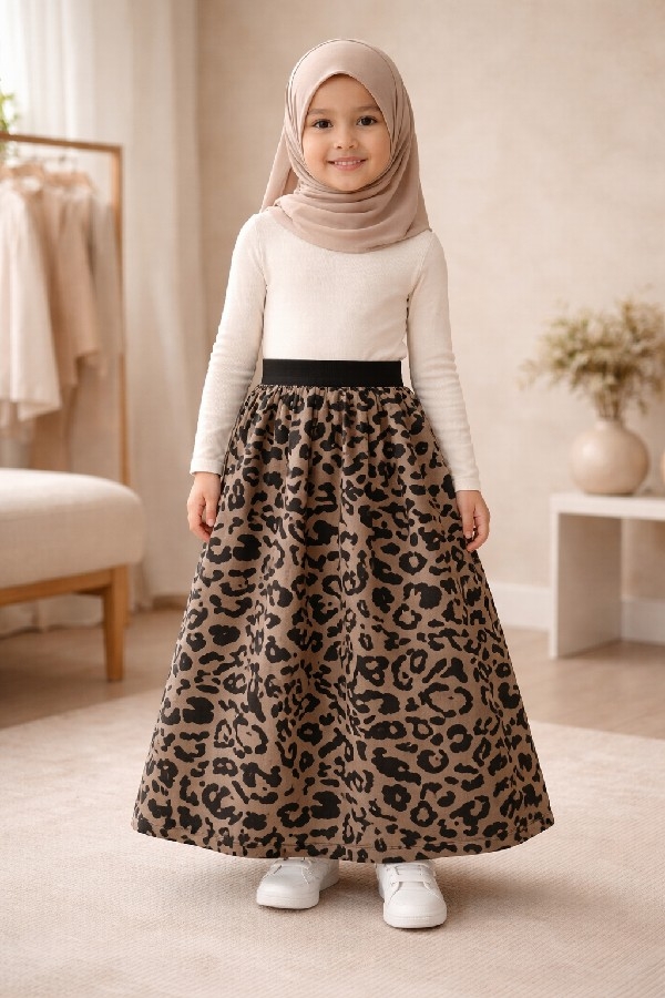 Kız Çocuk Kahve Leopar Desenli Full Astarlı Uzun Etek