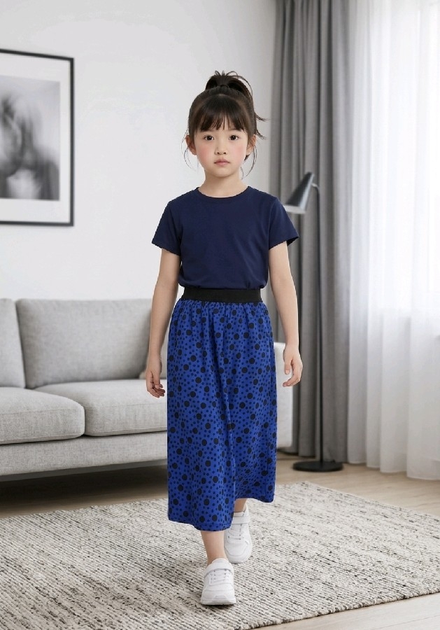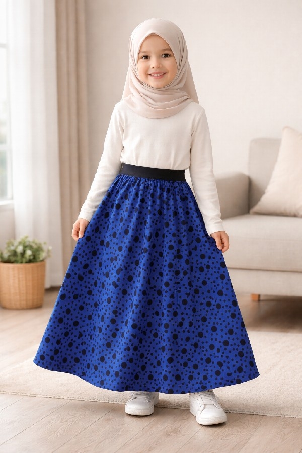 Kız Çocuk Saks Mavisi Puantiye Desenli Full Astarlı Uzun Etek